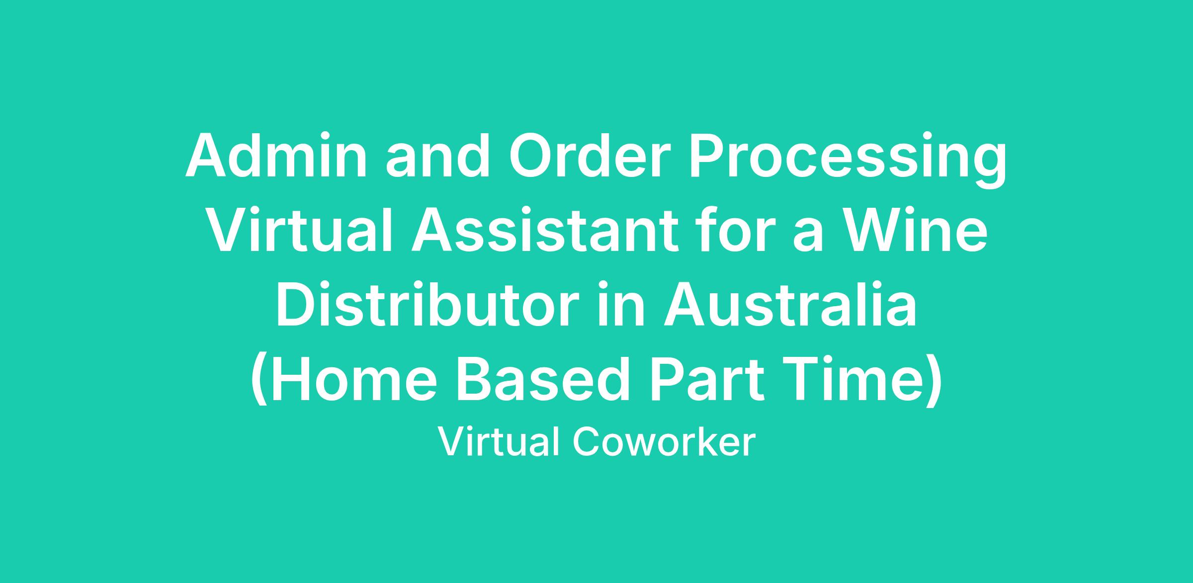 https:\/\/www.linkedin.com\/company\/virtual\-coworker"}],"isMobile":false,"iframe":"true","jobType":"Part time","applyName":"Apply Now!","zsoid":"8208015","FontFamily":"Arial, Helvetica, sans\-serif","jobOtherDetails":[{"fieldLabel":"Job Category","uitype":2,"value":"Virtual Assistant"},{"fieldLabel":"Work Schedule","uitype":1,"value":"Monday to Friday, 9:00am \- 1:00pm Australian Eastern Standard Time"},{"fieldLabel":"Hours Per Day","uitype":2,"value":"Part Time â 4 hours per day"},{"fieldLabel":"Industry","uitype":2,"value":"Food Industry"},{"fieldLabel":"Client Location","uitype":2,"value":"Australia"},{"fieldLabel":"Work Location","uitype":1,"value":"Home Based \- Philippines"},{"fieldLabel":"City","uitype":1,"value":"Smithfield"},{"fieldLabel":"State\/Province","uitype":1,"value":"New South Wales"},{"fieldLabel":"Zip\/Postal Code","uitype":1,"value":"2164"}],"headerName":"Admin and Order Processing Virtual Assistant for a Wine Distributor in Australia (Home Based Part Time)","widgetId":"147741000000390320","isJobBoard":"false","userId":"147741000000027001","attachArr":[],"customTemplate":"3","isCandidateLoginEnabled":true,"jobId":"147741000074477049","FontSize":"12","location":"Smithfield","embedsource":"CareerSite","logoId":"idwop0ece2fcac21a443ba16938fb832bdc3b"}