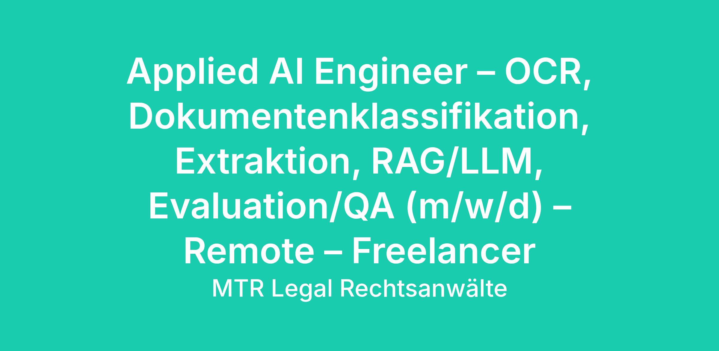 Applied AI Engineer – OCR, Dokumentenklassifikation, Extraktion, RAG/LLM, Evaluation/QA (m/w/d) – Remote – Freelancer