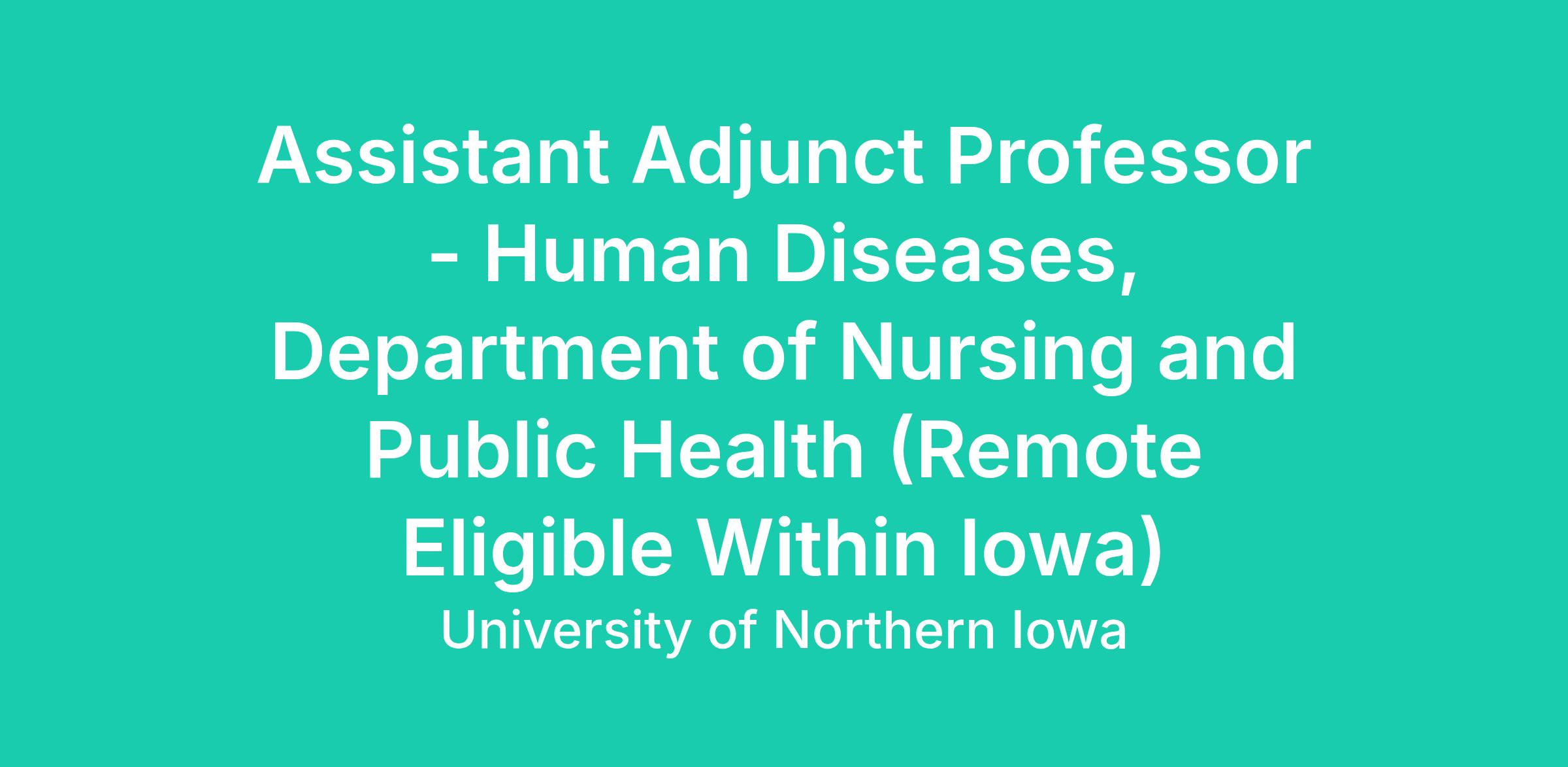The University of Northern Iowa's Department of Nursing & Public Health seeks applications for an Assistant Adjunct Professor in Public Health position, for the Fall 2026 semester. We seek a dynamic and dedicated individual to teach an online Public Health course – PH 4663 Human Diseases. For information about the Department of Nursing and Public Health, please visit https://csbs.uni.edu/nursing-public-health.