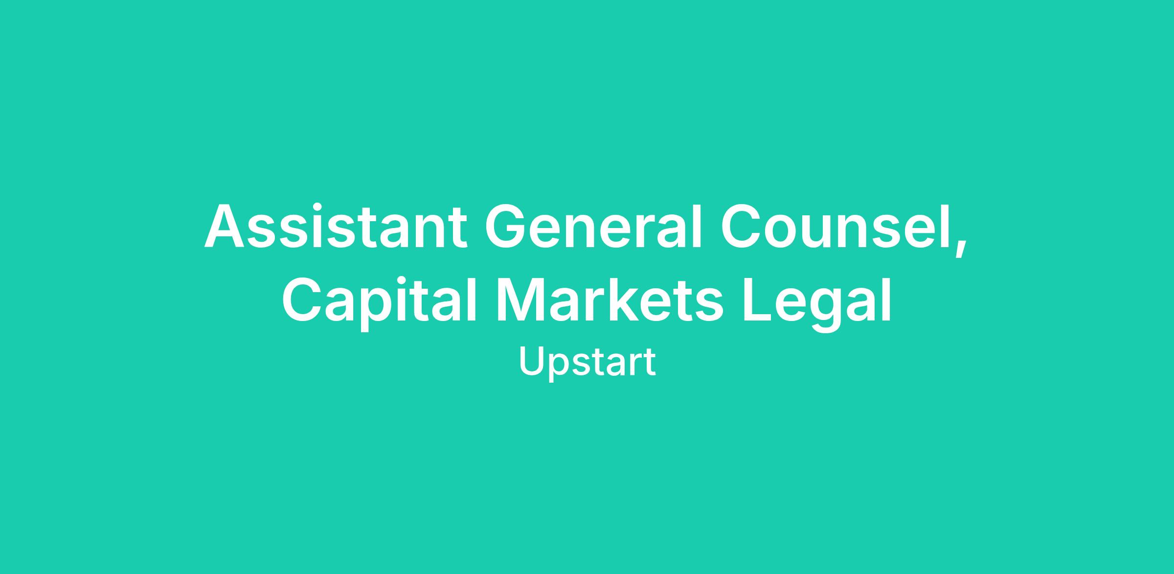As the Assistant General Counsel (Director), Capital Markets Legal at Upstart, you will work with counterparties across Upstart including members of the product, operations, compliance, accounting, tax, treasury and finance teams. You will work on bilateral deals, small club deals, broadly syndicated deals and everything in between.