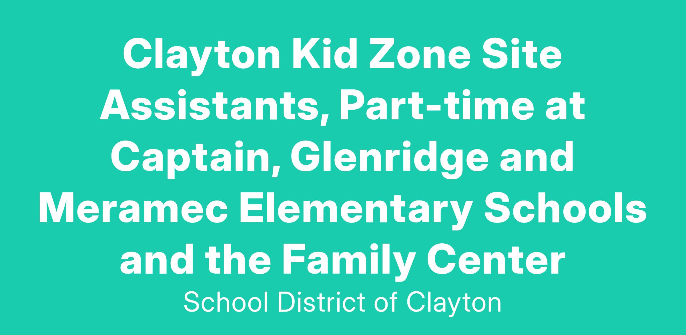 The School District of Clayton is seeking Site Assistants for Clayton Kid Zone, the District's before and after school child care program. The Site Assistant will be responsible for the supervision of the students and providing a safe environment, as well as planning activities and experiences for the Kid Zone program. Program hours are 6:45 - 8:30 a.m. and 3:00-6:00 p.m.