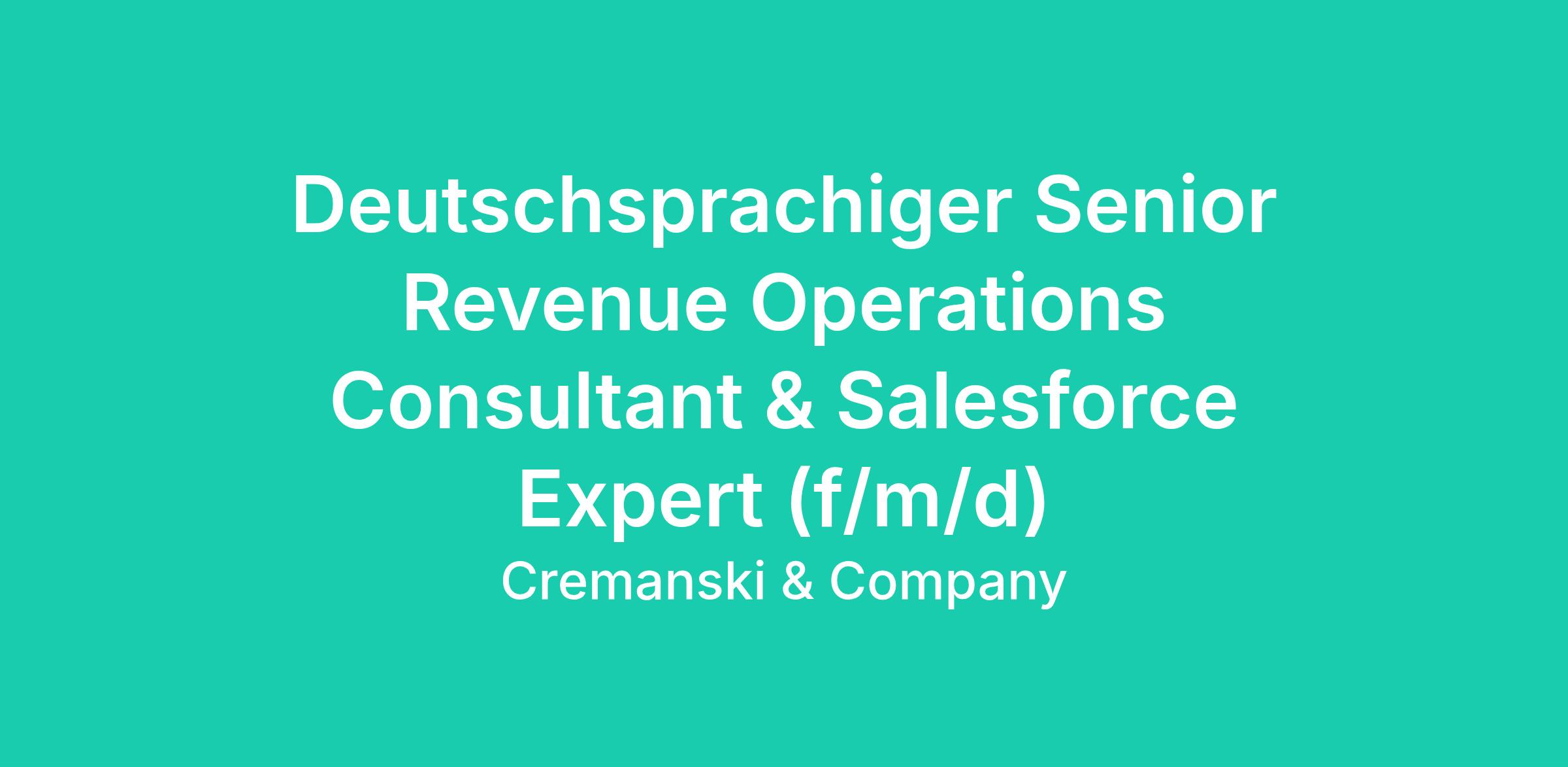 Cremanski & Company ist die führende B2B SaaS-Beratung im DACH Bereich. Wir unterstützen Commercial Teams von Start-ups und Scale-ups dabei, effizientes Wachstum durch die Optimierung ihrer Revenue Architektur zu generieren. Unser Ziel ist es, ein internationales Team aus motivierten Pionieren aufzubauen. Klingt nach Dir? Dann werde jetzt Teil des Cremanski Team!