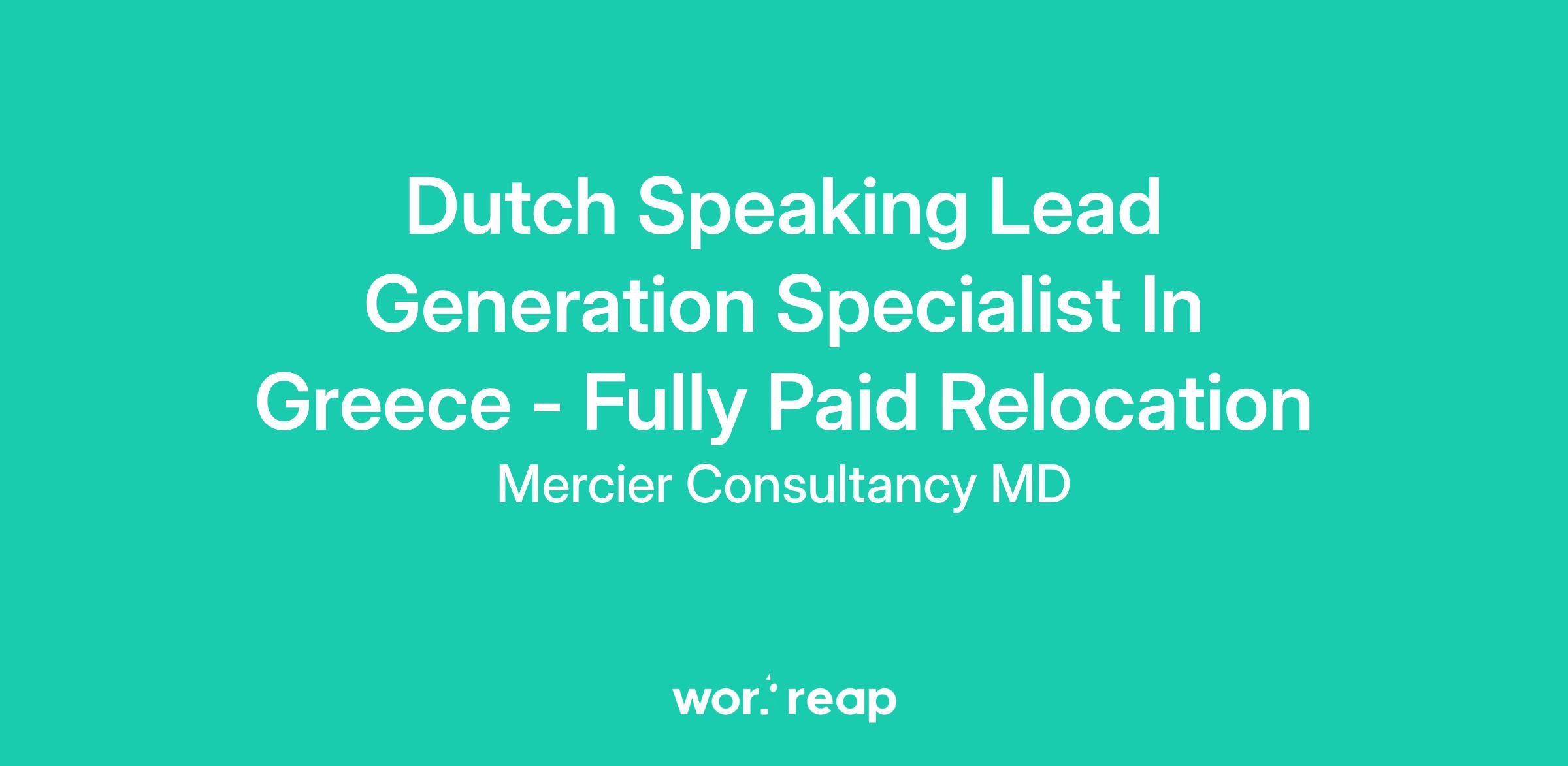 DescriptionMercier Consultancy MD is seeking a motivated Dutch Speaking Lead Generation Specialist to join our dedicated team in Greece. This role offers the unique opportunity of fully paid relocation, allowing you to immerse yourself in a vibrant culture while contributing to our online network platform. You will be responsible for generating leads within Dutch-speaking markets, fostering initial relationships, and promoting our innovative services.