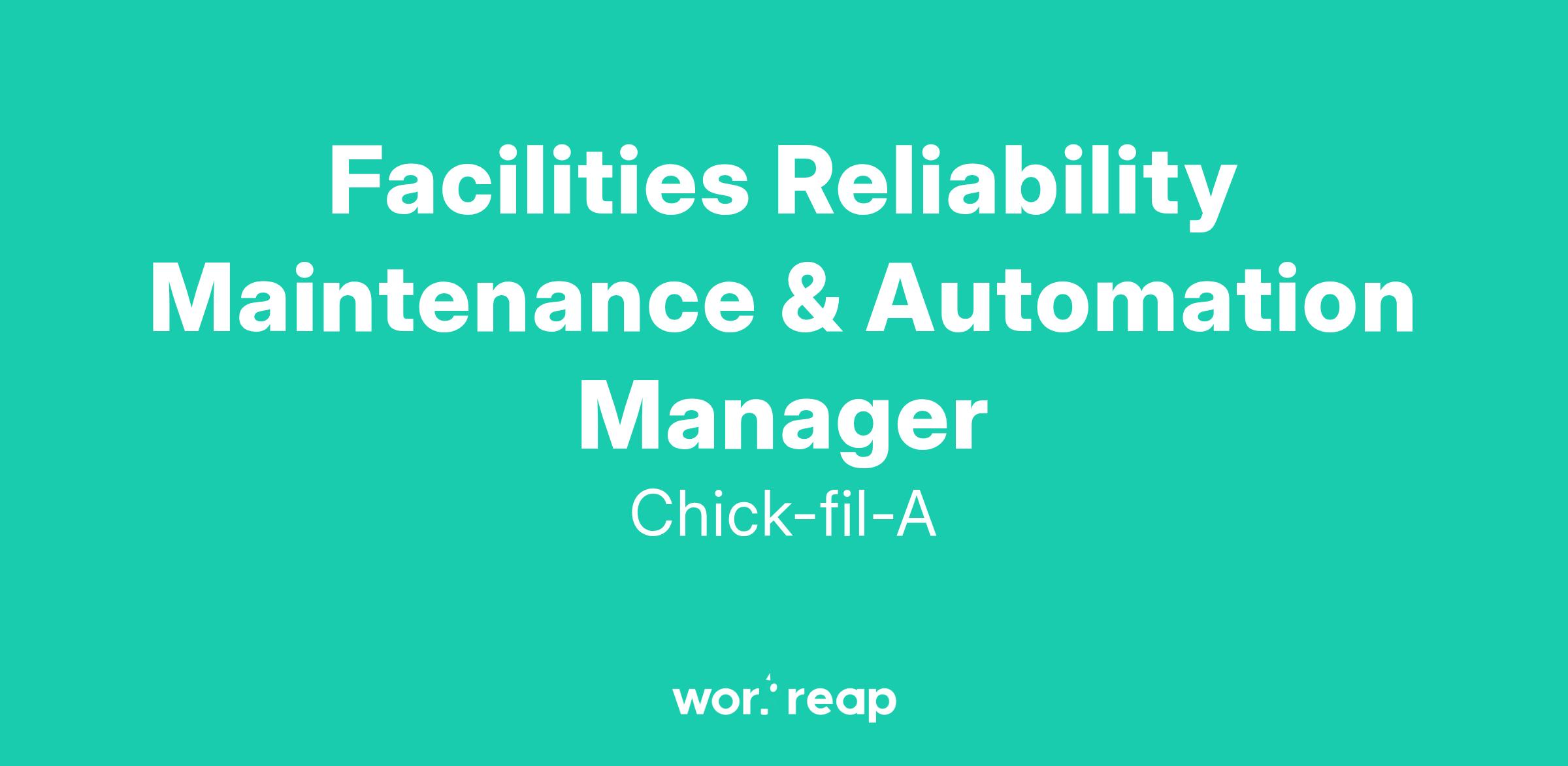The Facilities Reliability Maintenance & Automation Manager will serve as the leader of maintenance operations at the Chick-fil-A Supply Distribution Center (DC) in Elsmere, KY.