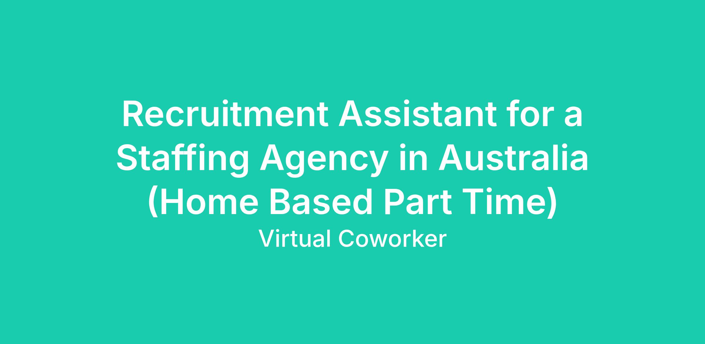 https:\/\/www.linkedin.com\/company\/virtual\-coworker"}],"isMobile":false,"iframe":"true","jobType":"Part time","applyName":"Apply Now!","zsoid":"8208015","FontFamily":"Arial, Helvetica, sans\-serif","jobOtherDetails":[{"fieldLabel":"Job Category","uitype":2,"value":"Virtual Assistant"},{"fieldLabel":"Work Schedule","uitype":1,"value":"MondayâFriday, 10:00am \- 2:00pm Australian Eastern Standard Time"},{"fieldLabel":"Hours Per Day","uitype":2,"value":"Part Time \- 4 Hours per day"},{"fieldLabel":"Industry","uitype":2,"value":"Recruitment"},{"fieldLabel":"Client Location","uitype":2,"value":"Australia"},{"fieldLabel":"Work Location","uitype":1,"value":"Home Based \- Philippines"},{"fieldLabel":"City","uitype":1,"value":"St Leonards"},{"fieldLabel":"State\/Province","uitype":1,"value":"New South Wales"},{"fieldLabel":"Zip\/Postal Code","uitype":1,"value":"2065"}],"headerName":"Recruitment Assistant for a Staffing Agency in Australia (Home Based Part Time)","widgetId":"147741000000390320","isJobBoard":"false","userId":"147741000000027001","attachArr":[],"customTemplate":"3","isCandidateLoginEnabled":true,"jobId":"147741000074469253","FontSize":"12","location":"St Leonards","embedsource":"CareerSite","logoId":"idwop0ece2fcac21a443ba16938fb832bdc3b"}