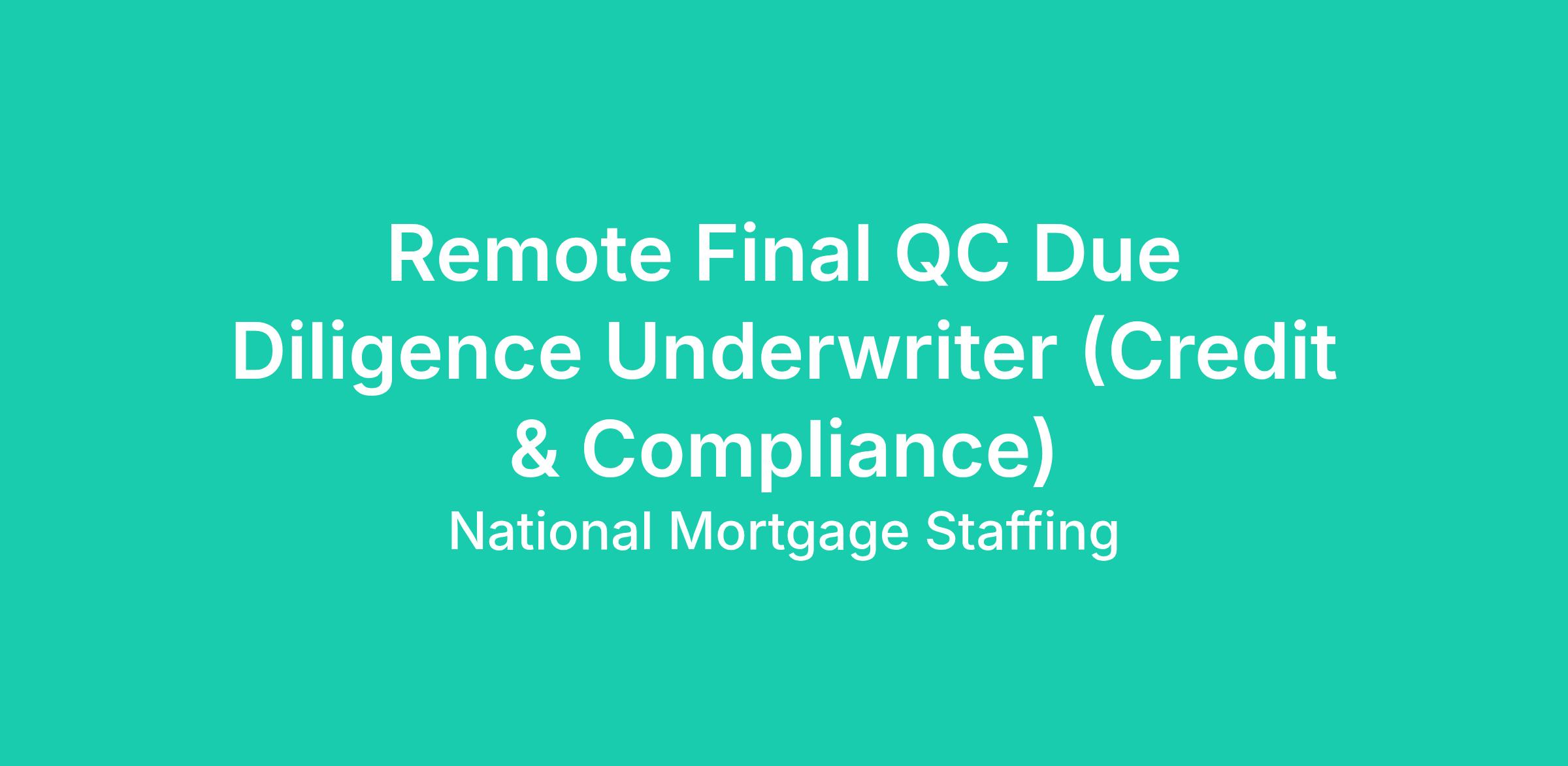 We are hiring a remote Final QC Due Diligence Underwriter (Credit & Compliance) to support secondary market final mortgage loan review projects. In this role, you will perform final quality control reviews on loans completed by Due Diligence Underwriters and ensure each file is accurate, compliant, and aligned with investor and regulatory guidelines.