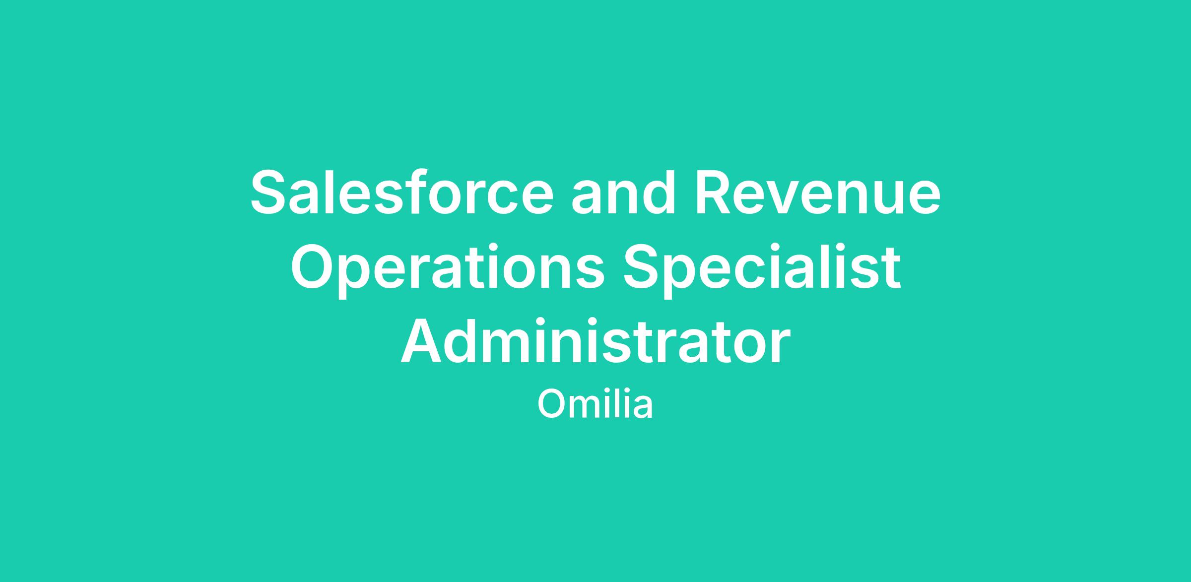 DescriptionOmilia is seeking an experienced Salesforce and Revenue Operations Specialist Administrator to join its Revenue Operations team. This individual will be responsible for the administration, support, and training of Salesforce. The ideal candidate is a proactive problem-solver with a strong understanding of Salesforce and business processes, eager to enhance Omilia's RevOps tech stack.