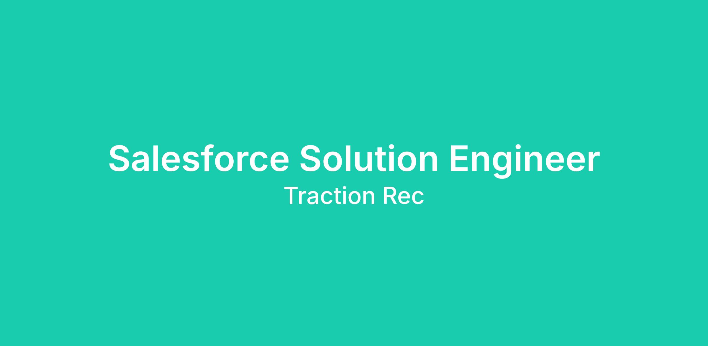 We’re looking for a Solution Engineer to join our team and be part of our next stage of growth. As our Solution Engineer, your top priority is to support our pre-sales and engagement teams to assist customers and lead strategies to bring innovative solutions that map Salesforce and Traction Rec solutions to meet customer needs, support the sales cycle, set client expectations on future state, and set up the customer for long term success. You will use your industry experience and technology expertise to assist customers managing change, evolving their business process and maximizing their technology investment. You will work cross functionally with our product, services, support, sales and engagement teams to enable the success of our customers.